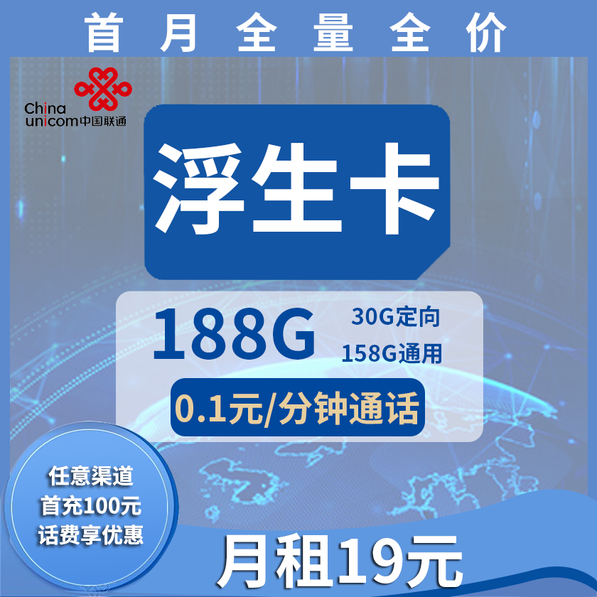 浮生卡19元包158G通用+30G定向+通话0.1元/分钟